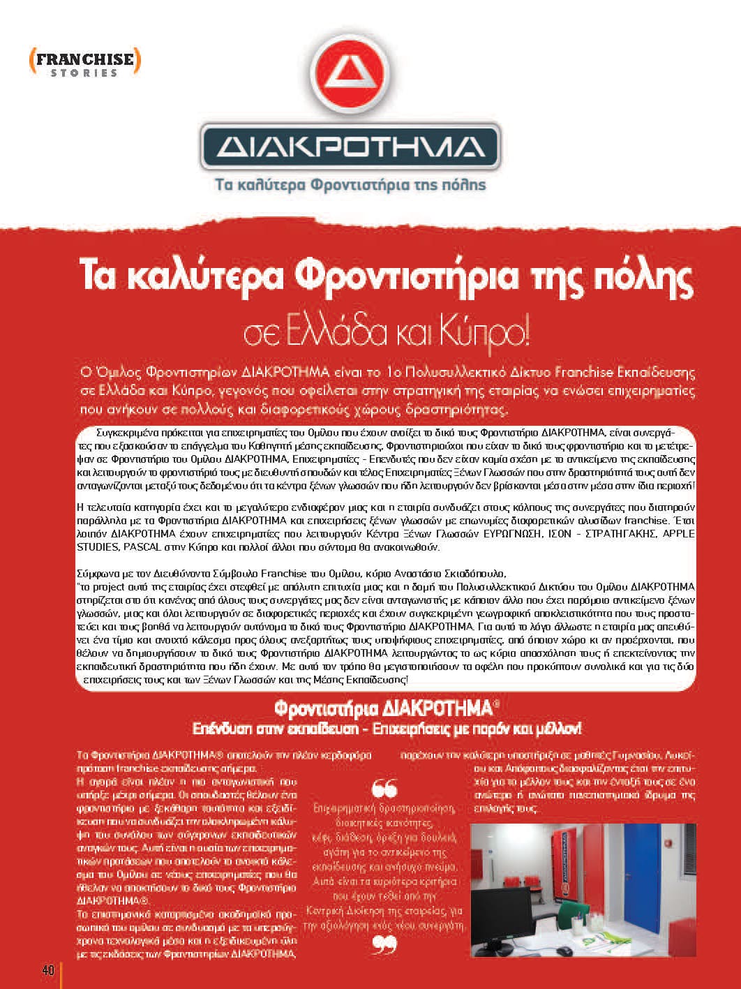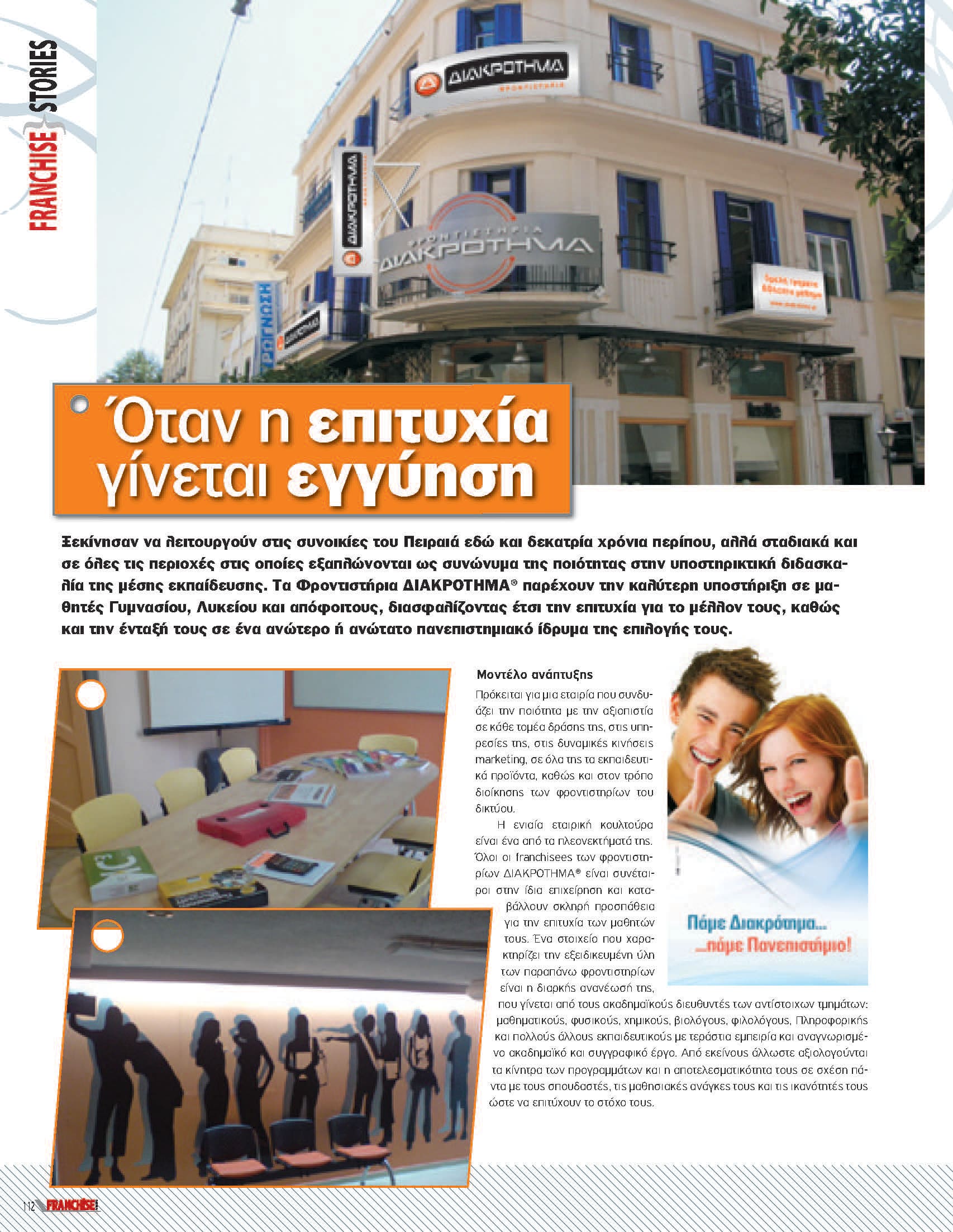 Τα φροντιστήρια ΔΙΑΚΡΟΤΗΜΑ διαθέτουν το πιο εξελιγμένο και καινοτόμο σύστημα franchise εκπαίδευσης στην ελληνική αγορά. Το επιστημονικά καταρτισμένο Ακαδημαϊκό προσπωπικό του Ομίλου, τα Υπερσύγχρονα Τεχνολογικά Μέσα και η Εξειδικευμένη Ύλη με τις Εκδόσεις των φροντιστηρίων ΔΙΑΚΡΟΤΗΜΑ παρέχουν την καλύτερη υποστήριξη με μαθητές Γυμνασίου, Λυκείου και Απόφοιτους διασφαλίζοντας έτσι την επιτυχία τους.